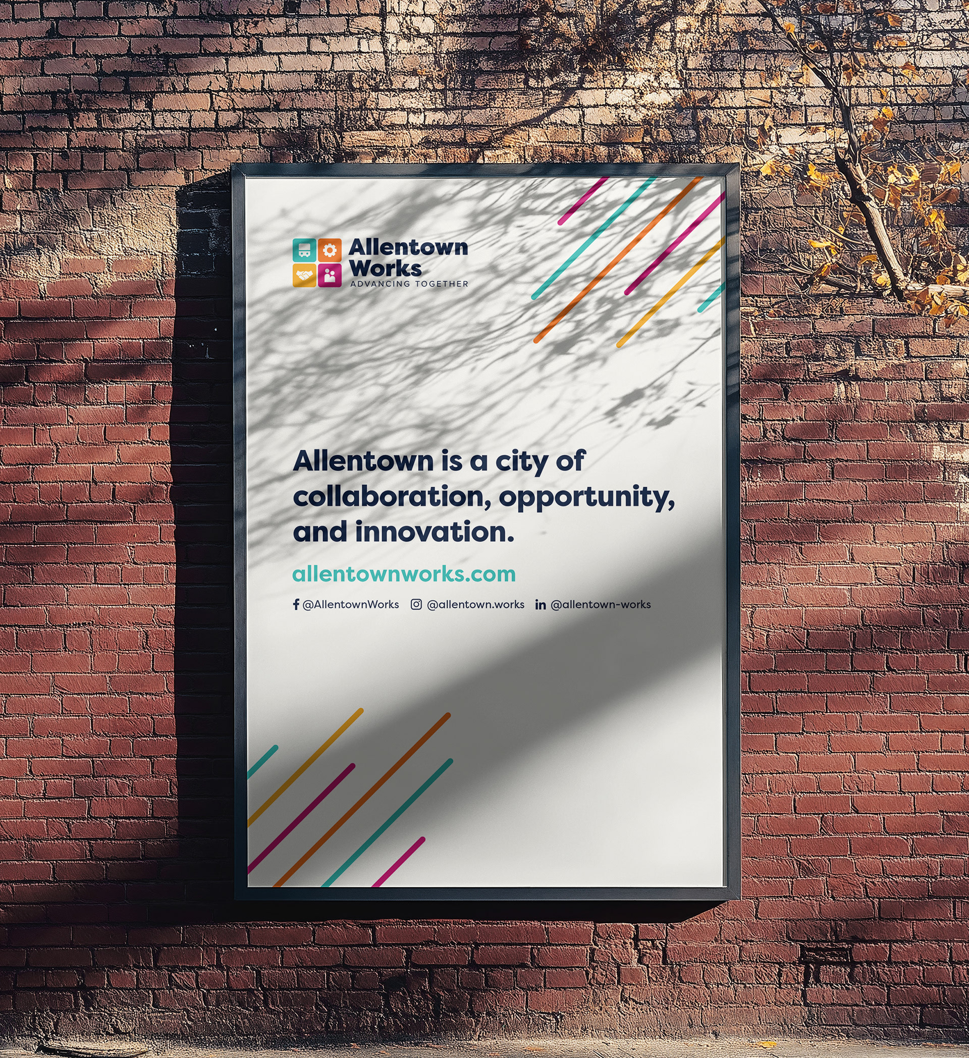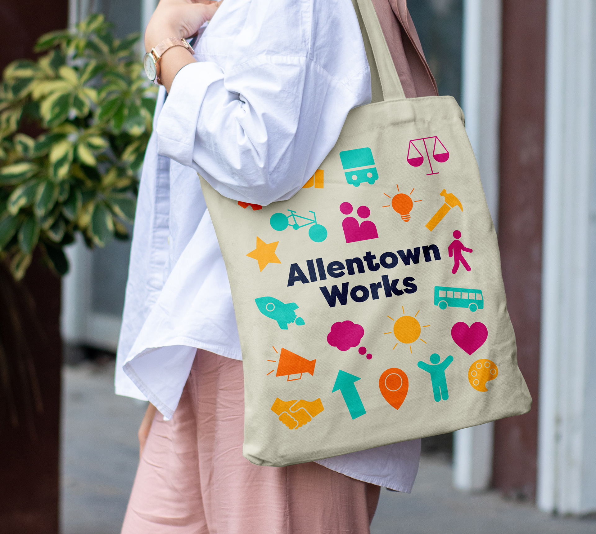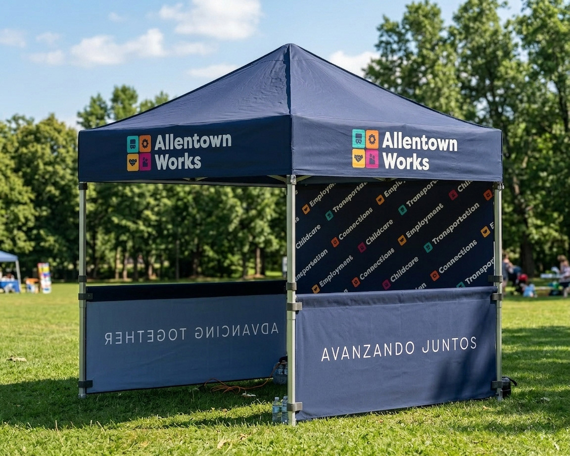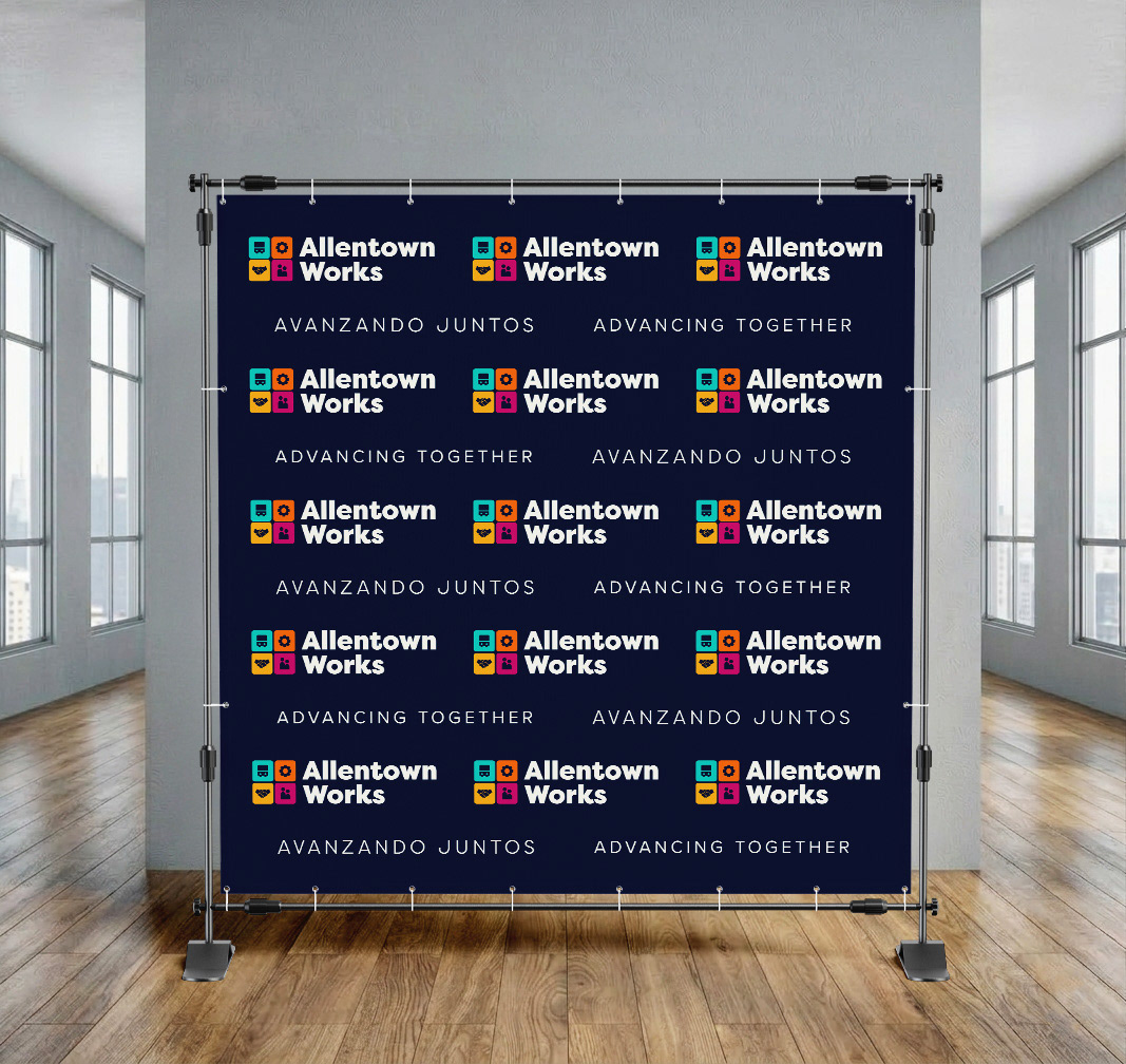 The Allentown Works visual identity was applied across print, digital, and environmental marketing campaigns, including a branded pop-up tent where the team gave away bags, stickers, journals, t-shirts and more!