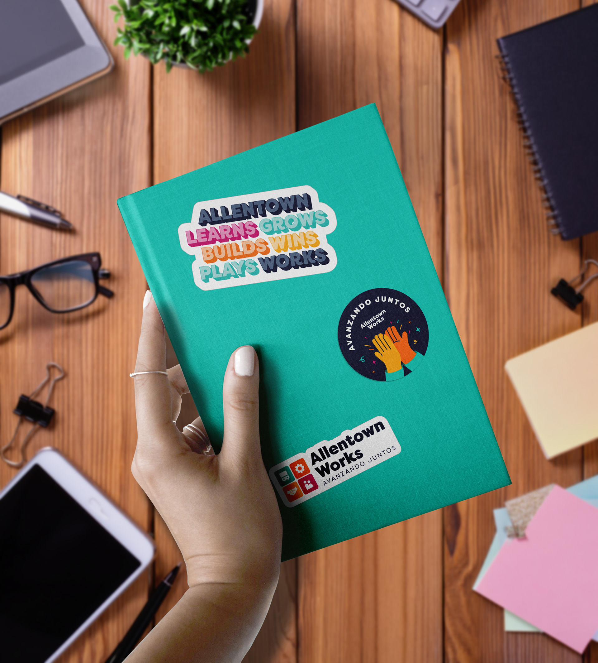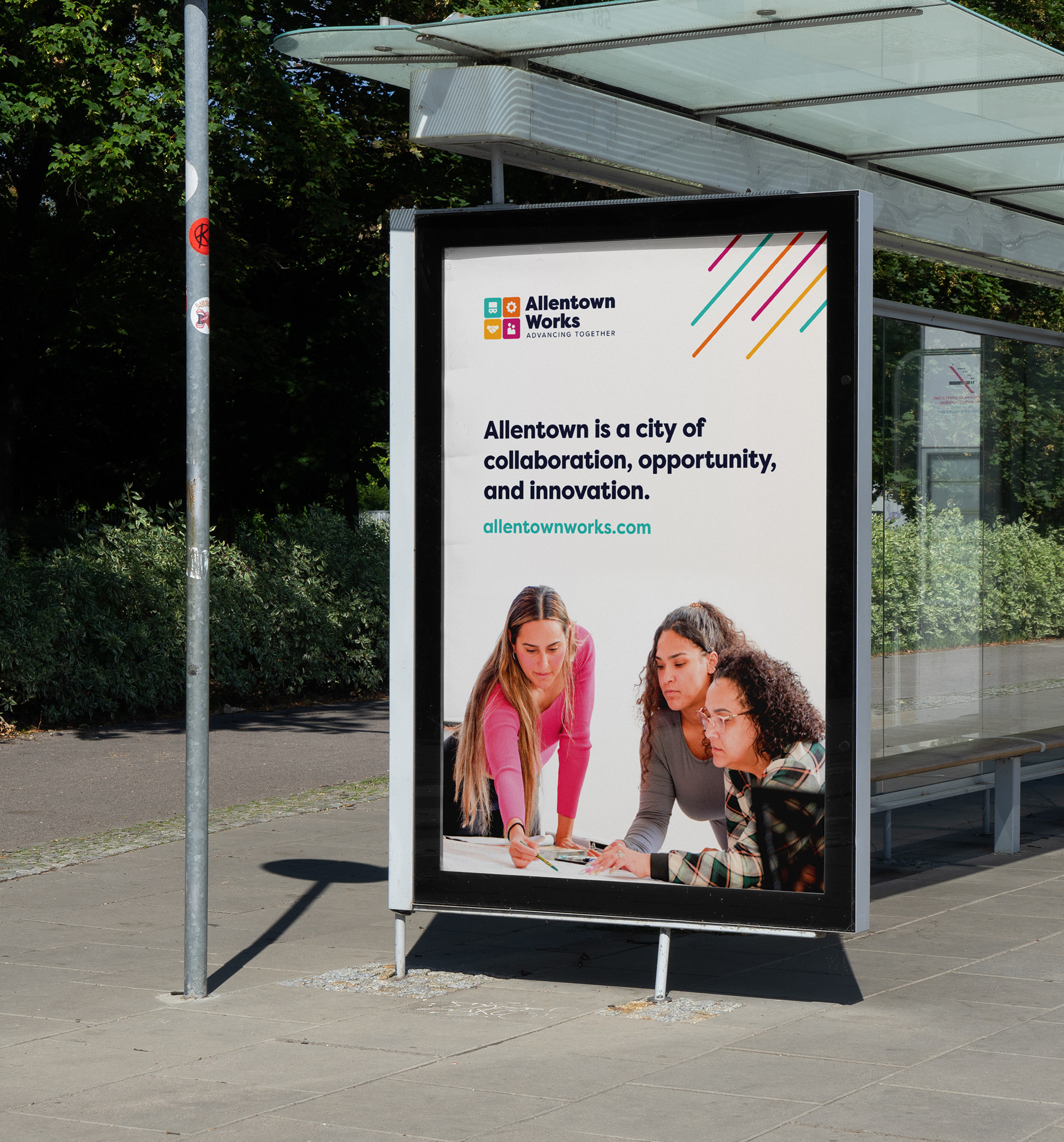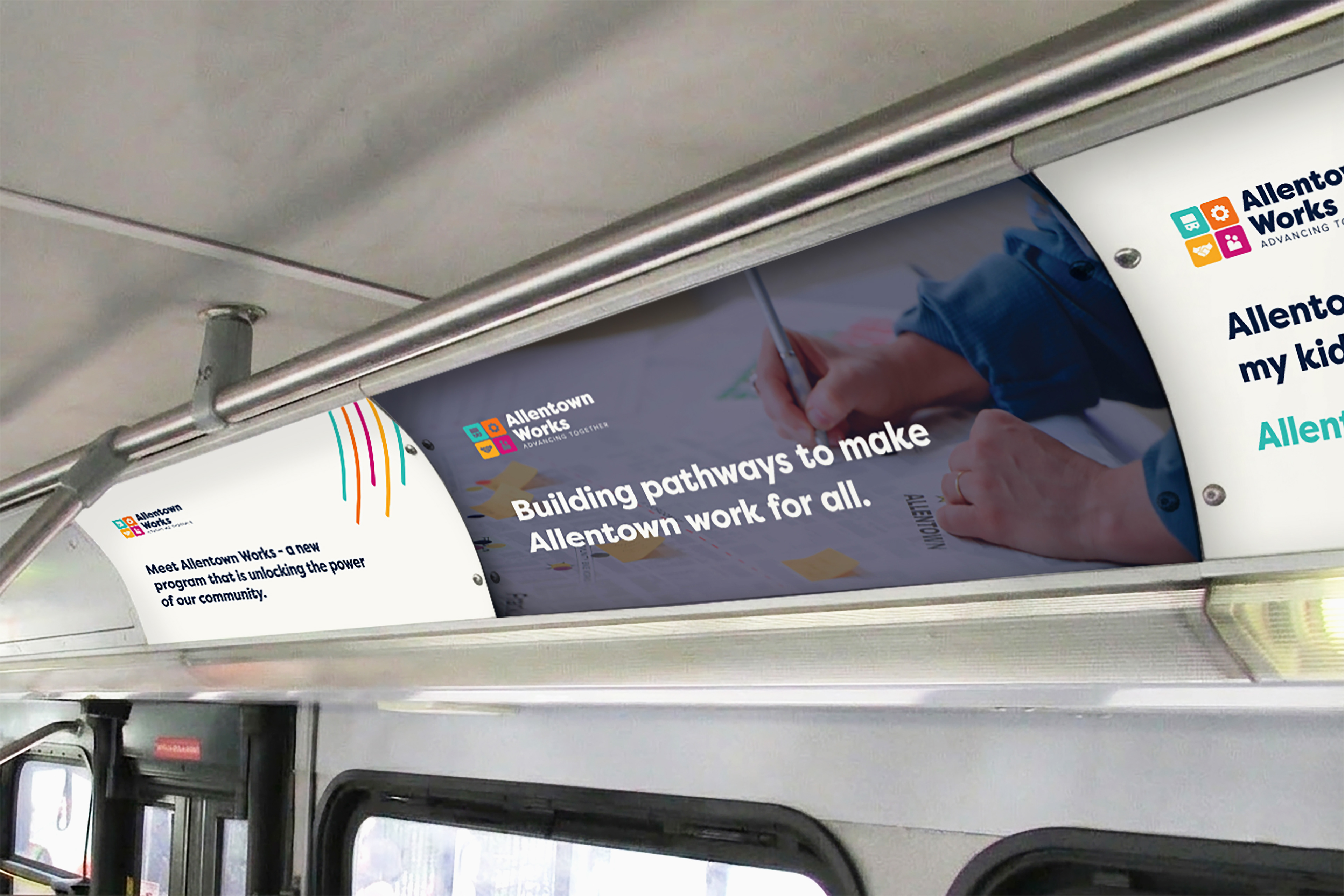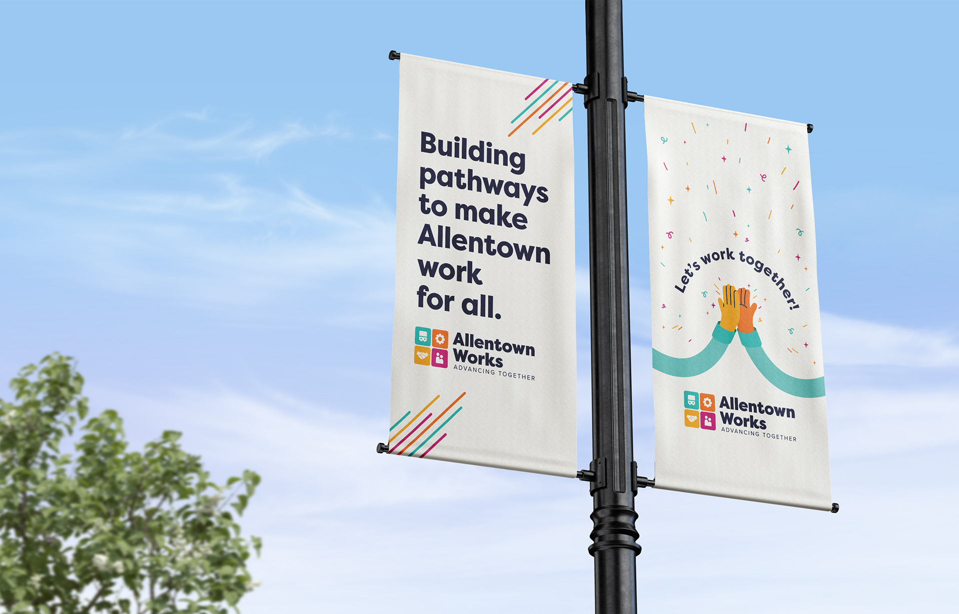 The Allentown Works visual identity was applied across print, digital, and environmental marketing campaigns, including a branded pop-up tent where the team gave away bags, stickers, journals, t-shirts and more!