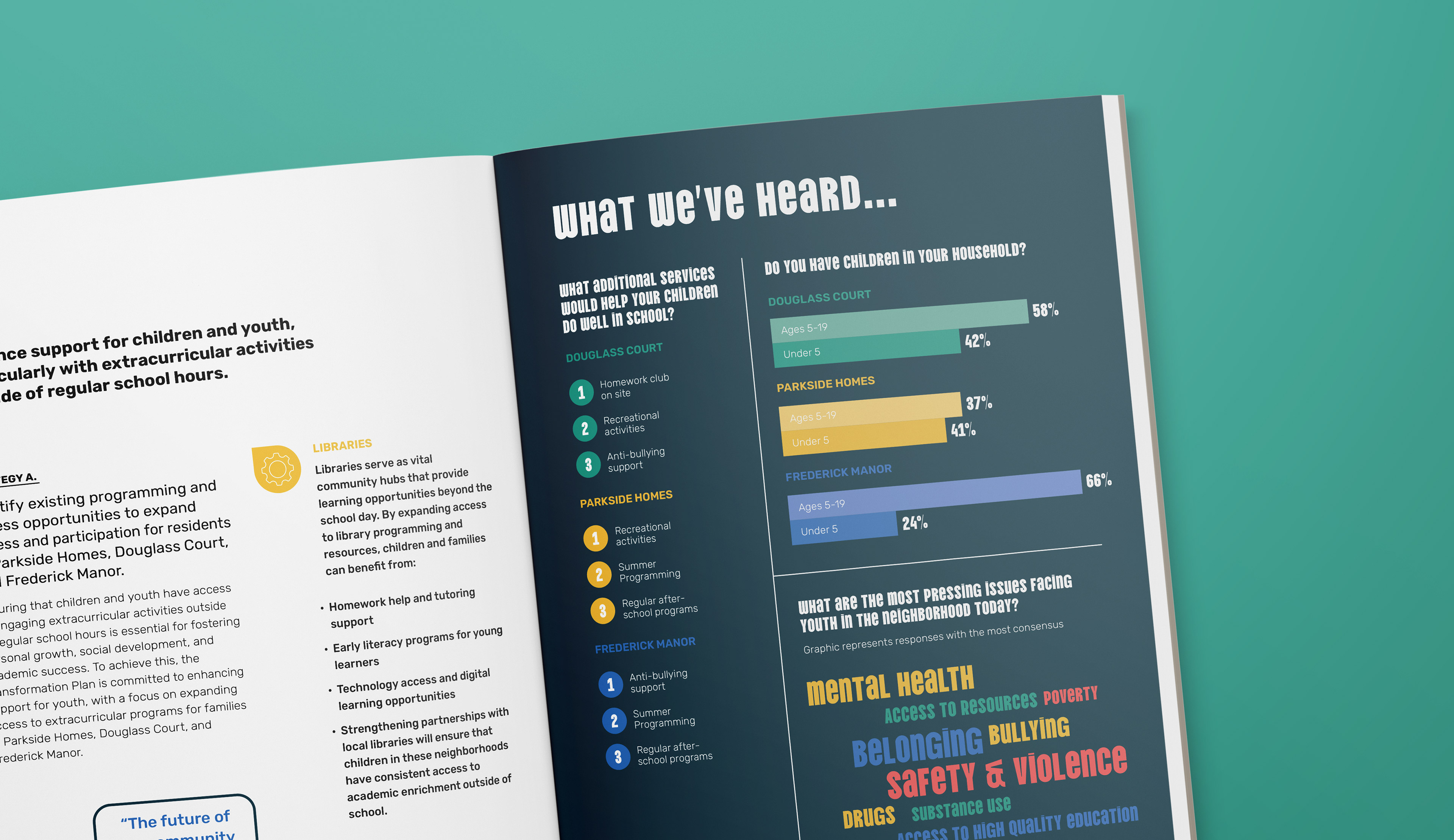 The final plan document is where the brand really came to life. Across more than 200 pages, the bold color palette, playful typography, and graphic shapes established in the identity system had to work across a huge range of content, from data-heavy infographic spreads and transit maps to Community Ambassador profiles and resident quote pages.