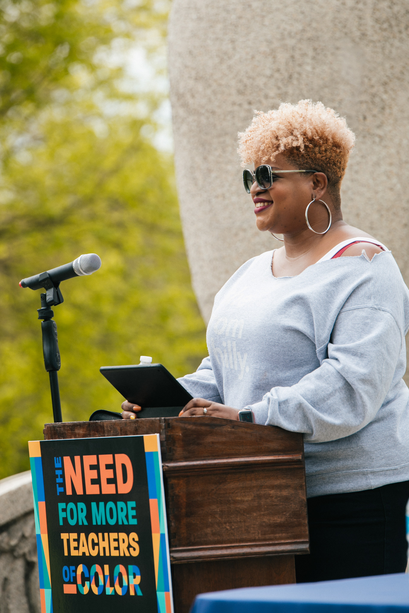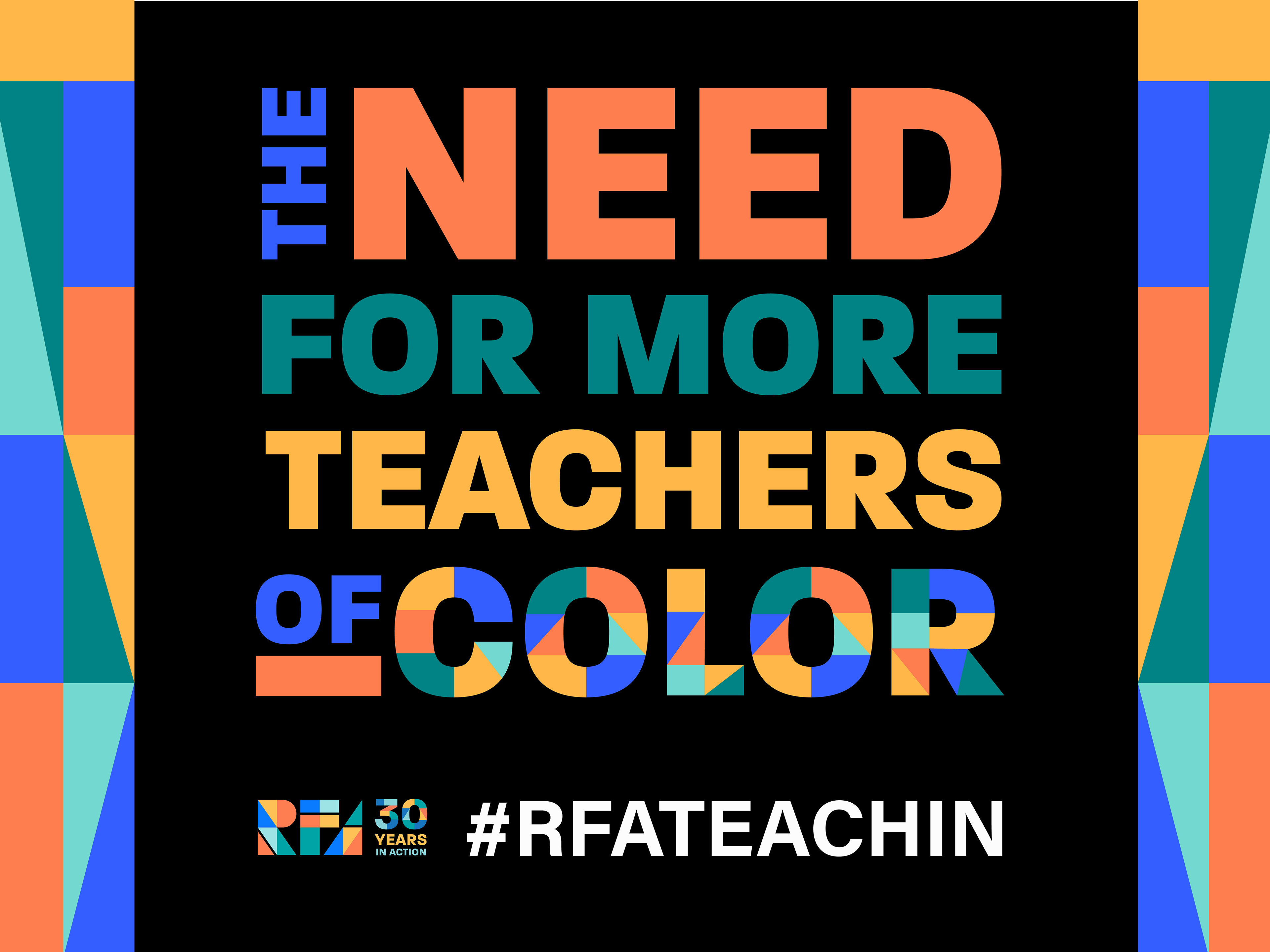 The RFA TeachIn explored efforts toward diversifying the teacher workforce with live speakers and printed materials at the TeachIn. The event's headline was "The Need for More Teachers of Color," and the graphic above was used on the speaker's podium and as the cover of an informational booklet.